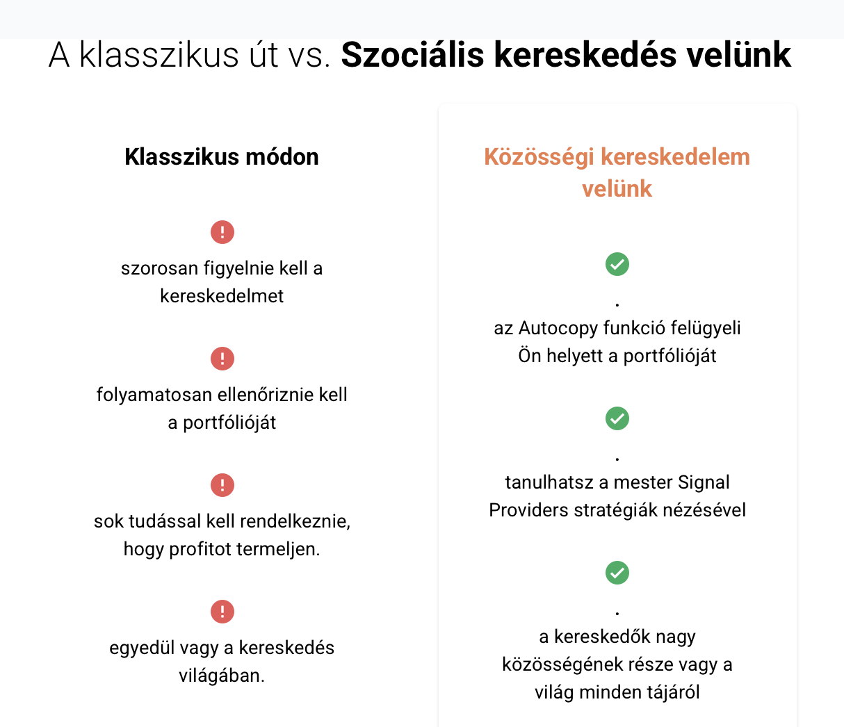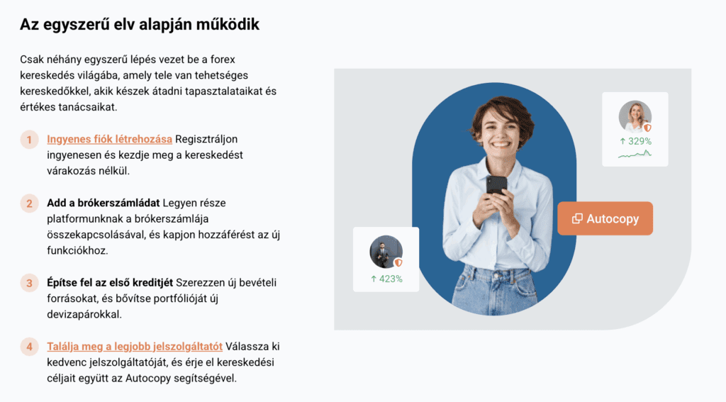 Az egyes szakaszok, mint például a Piac, az AutoCopy és az Ajánlóprogram logikusan vannak felosztva, így még a kezdők is gyorsan eligazodnak a felületen.